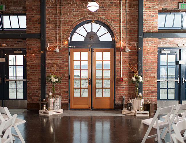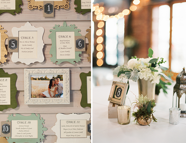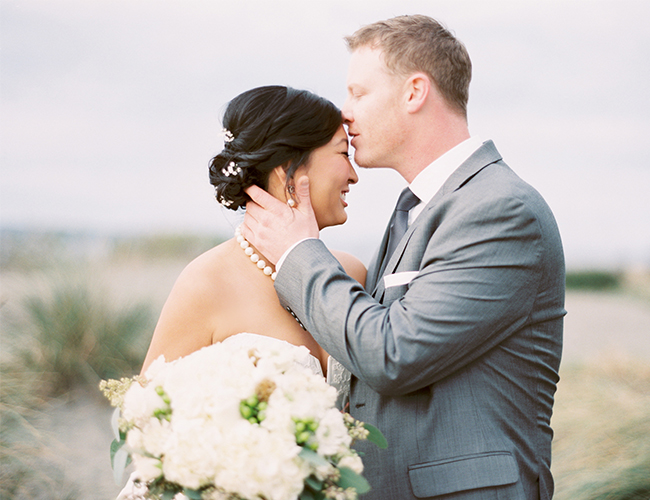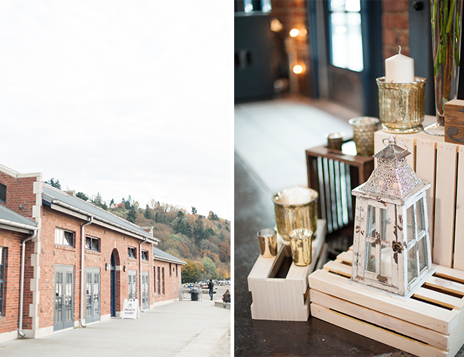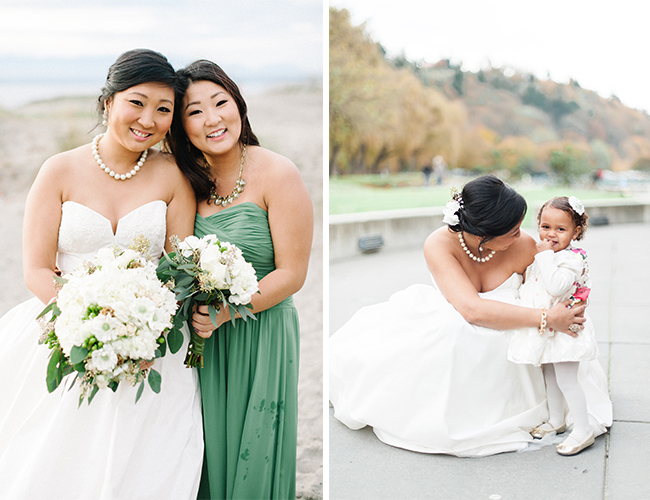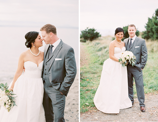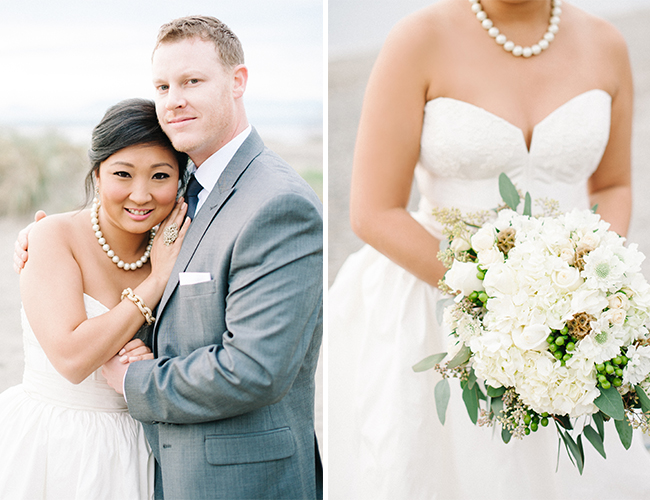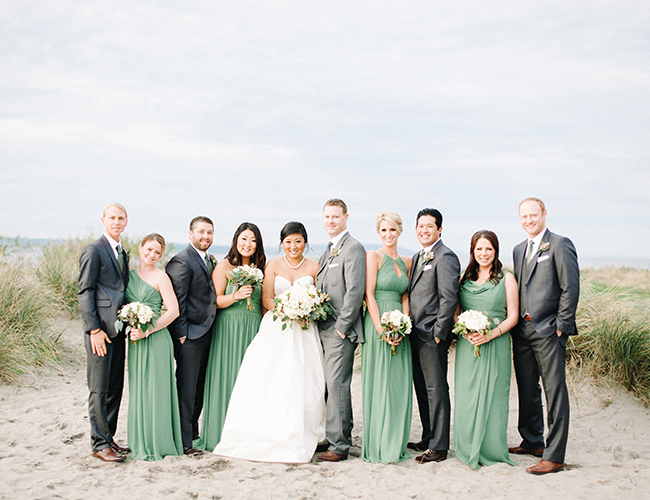 This Winter wedding on our wedding blog today is beautifully set on an overcast beach and in a pretty brick building in Seattle, Washington. The neutral and green details perfectly complimented the beach location and the stunning bridal party, making us ooh and ahh over and over. We’re in love with the bridesmaid’s jade gowns in various floor length styles that sway in the sandy breeze. Centerpieces of votive candles, vases, and lanterns lit up the reception and ceremony areas with light and beauty. The couple worked hard DIY-ing favors and place cards and making the day all their own, but they themselves were truly the most stunning part! The bride wowed in a drop-dead-gorgeous kind of ball gown and pearls, and the photos of her with her groom on the beach are oh-so romantic. Brittany from Blue Rose Photography captured the beautiful day and shared a bit about it with us: