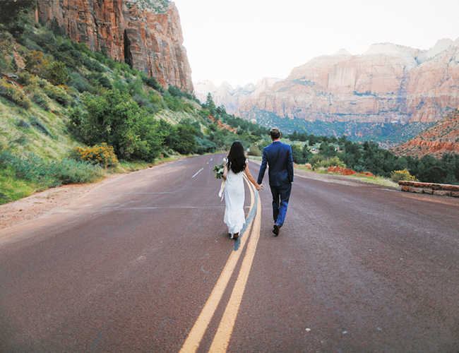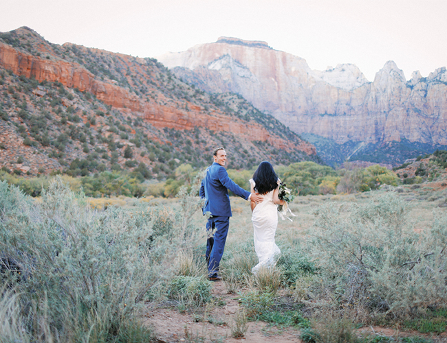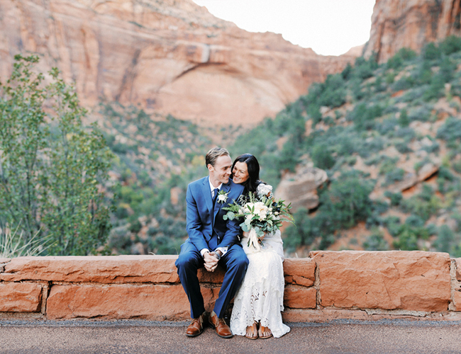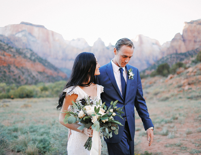 We have a true beut for you on our wedding blog with this Zion National Park Wedding. Yes, you read that correctly – this couple channeled their outdoorsy spirits and married among the AWEsome rocks of Zion where they had spent so much time together. We couldn’t think of a more beautiful spot for them to begin this new journey together, and boy did they look good doing so! Kaitlyn in a BHLDN gown and Sean in a navy suit, the bride and groom were a match for the scenery.